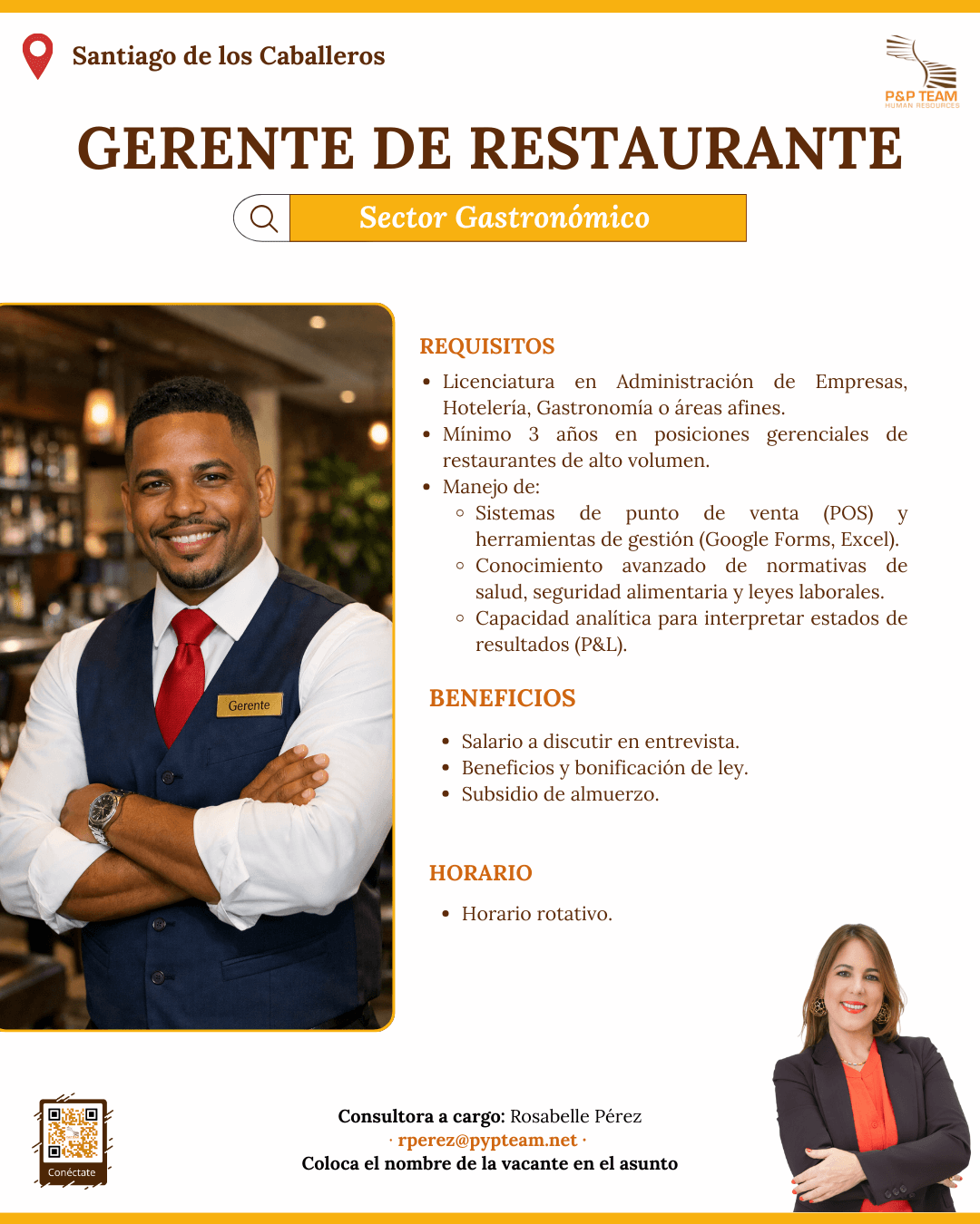 Experiencia mínima de 3 a 5 años en posiciones gerenciales de restaurantes de alto volumen.